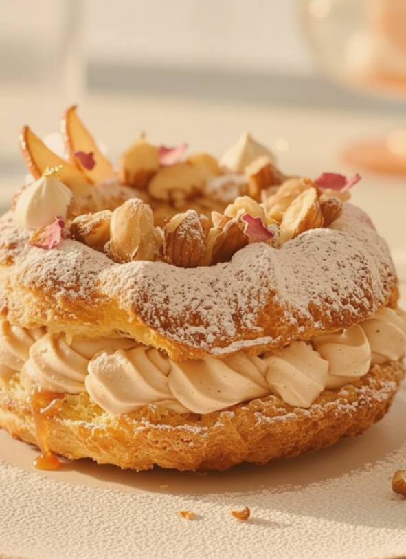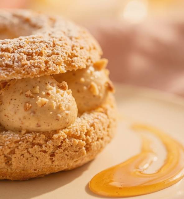 « A travers cette création j’ai souhaité interpréter avec élégance cette célèbre pâtisserie française. L’accord Paris-Brest révèle une signature gourmande et pralinée à la fois gourmande et onctueuse, réhaussé par un cœur floral »